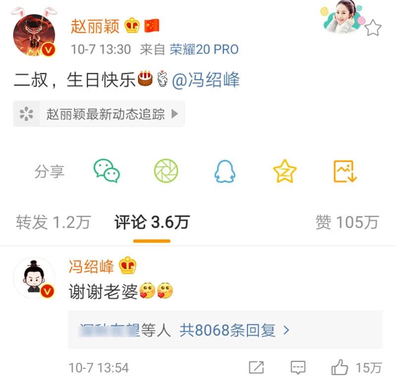 Giữa vợ chồng hay cặp tình nhân thường chúc sinh nhật hay bày tỏ những hành động ngọt ngào trên mạng xã hội có thể xem là chuyện rất bình thường, và minh tinh cũng không ngoại lệ. Ngày 07.10 vừa qua cũng là ngày cuối cùng trong kỳ nghỉ lễ Quốc Khánh Trung Quốc, trên mạng xã hội Triệu Lệ Dĩnh chúc mừng sinh nhật Phùng Thiệu Phong. Mặc dù chỉ có sáu chữ đơn giản “Nhị thúc, sinh nhật vui vẻ“, nhưng khán giả đều biết rằng thông qua cách gọi này, Triệu Lệ Dĩnh muốn bày tỏ tình cảm sâu đậm của mình.