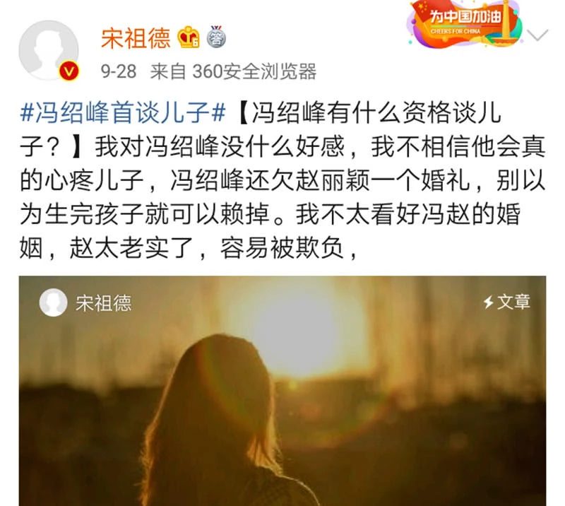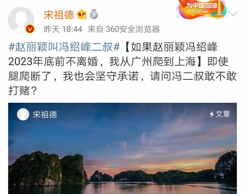 Thế nhưng, chuyện ân ái như thế giữa hai vợ chồng Phùng Thiệu Phong và Triệu Lệ Dĩnh lại chọc giận một người, người này chính là Tống Tổ Đức - được ví là miệng rộng trong ngành giải trí. Tối ngày 7 tháng 10, Tống Tổ Đức đăng lên Weibo bày tỏ: “Nếu như Triệu Lệ Dĩnh Phùng Thiệu Phong không ly hôn trước cuối năm 2023, tôi từ Quảng Châu bò tới Thượng Hải, cho dù chân có đứt cũng sẽ kiên trì thực hiện lời hứa, xin hỏi Phùng nhị thúc dám cá cược không?”