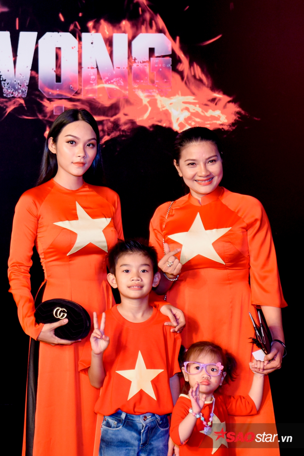 Hai mẹ con diễn viên Kiều Trinh và Thanh Tú diện trang phục áo dài có in cờ Việt Nam.