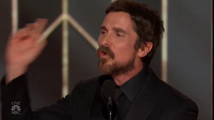 Christian Bale trở về bàn và ôm Amy Adams - bạn diễn của anh trong phim “Vice” để ăn mừng.