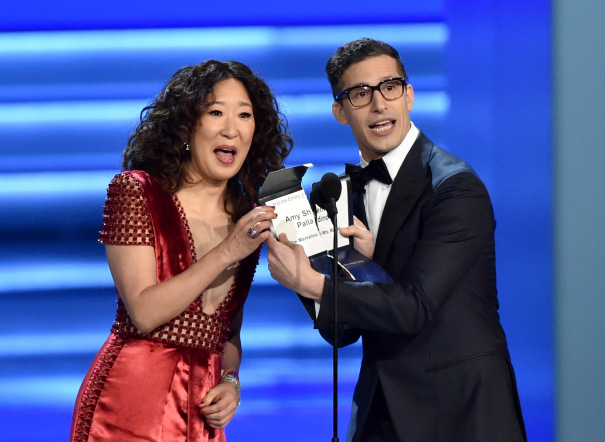 Sarah Oh và Andy Samberg tại Emmy 2018.