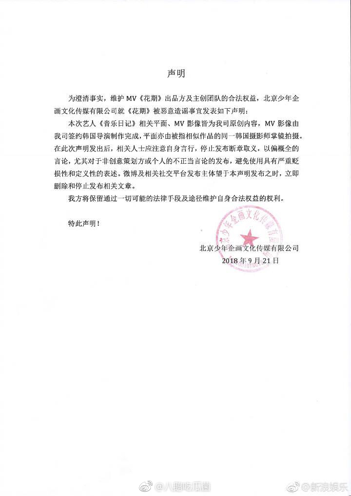 Ngay trong chiều ngày 21/09, nhà sản xuất MV Thời Kỳ Nở Hoa của Quan Hiểu Đồng đã đưa ra thông báo chính thức. Tuyên bố sẽ kiện các bên đưa ra ý xuyên tạc sai sự thật. Trong thông báo chính thức có đề cập: “Nói một cách công bằng, nội dung nguyên gốc của MV đều do bên phía đạo diễn Hàn Quốc sản xuất, việc quay chụp MV cũng cùng một người với IU nên có điểm tương đồng là khó tránh khỏi. Mong các bên đang đăng tin sai lệch xóa ngay bài viết, tránh việc liên quan đến pháp luật“.