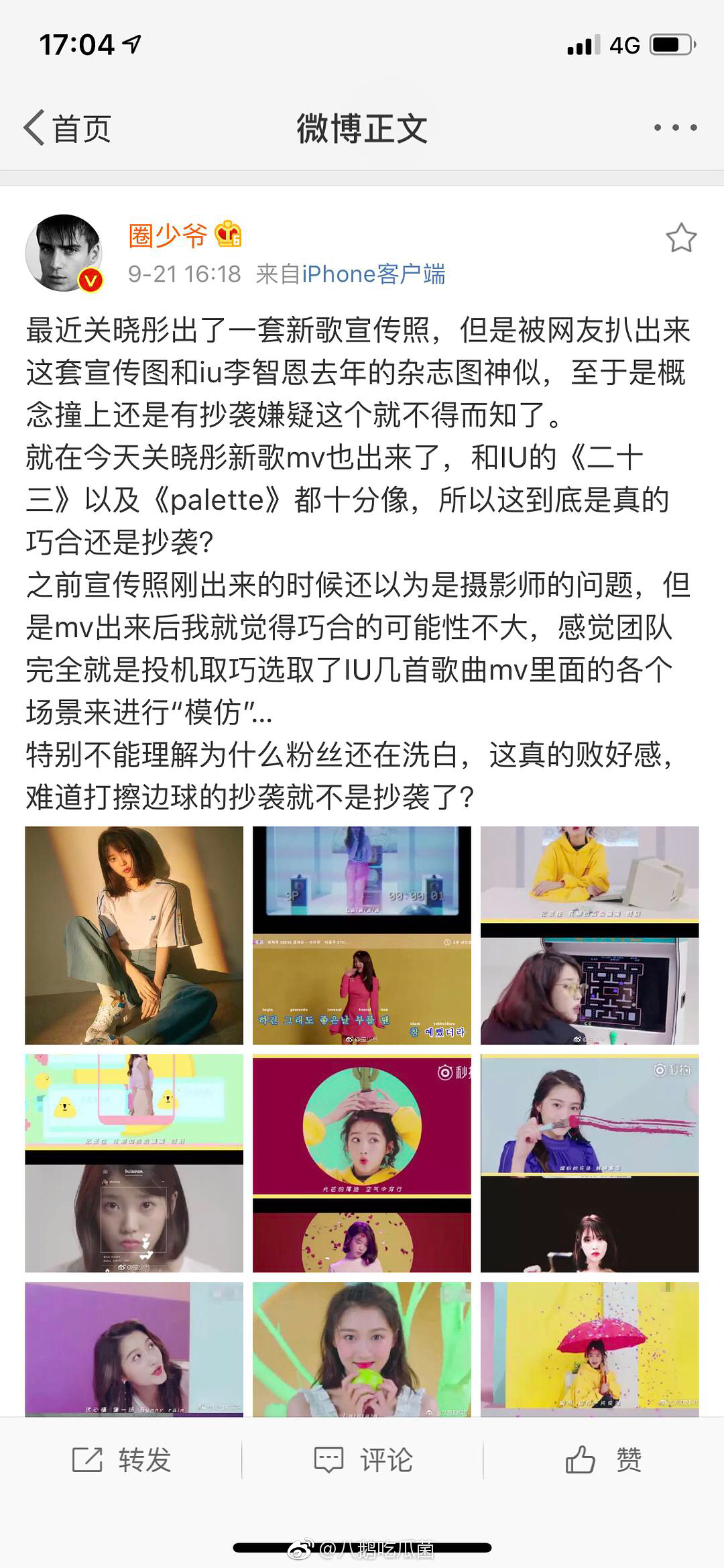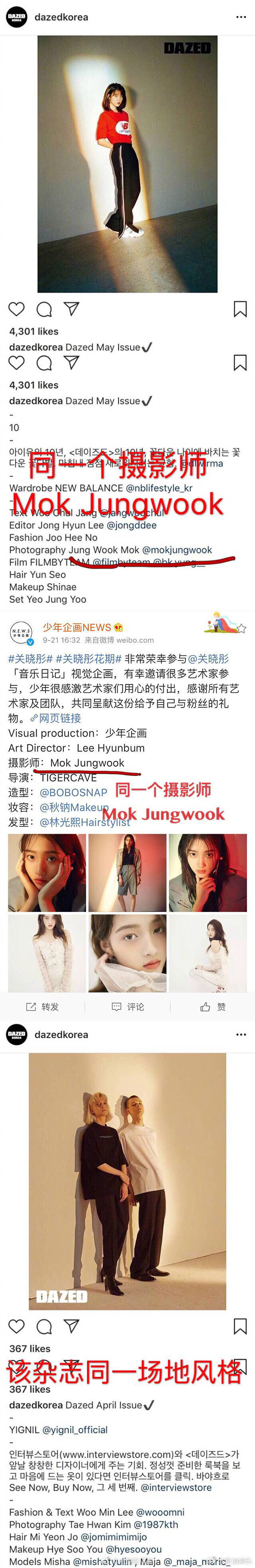 Ngay khi nghi án đạo MV của Quan Hiểu Đồng được cư dân mạng đưa lên, ảnh chụp bìa MV cũng được đem ra mổ xẻ là có quá nhiều điểm giống nhau về phong cách với ảnh chụp tạp chí vào năm 2017 của IU. Theo Sohu, MV đạo từ hình tượng, phong cách, ý tưởng đến các chi tiết cơ bản thậm chí là giai điệu bài hát. Chỉ là đạo cách “lộ liễu” một bước chân mà thôi.