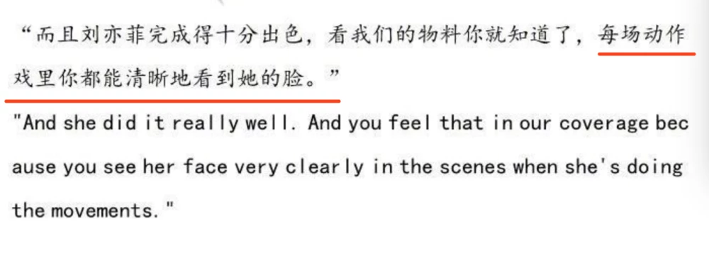 Vì lo sợ khán giả sẽ nghĩ cùng một ekip nên phải cố gắng dành lời khen cho diễn viên trong đoàn của mình, Mandy Walker đã nói rõ thêm: “Bạn có thể dễ dàng nhận ra được điều này bởi vì những cảnh quay đó đều cận cảnh khuôn mặt của cô ấy”. Quả thực, trong đoạn trailer giới thiệu những phân cảnh hành động của Lưu Diệc Phi đều có thể quan sát rõ nét mặt của nữ diễn viên.