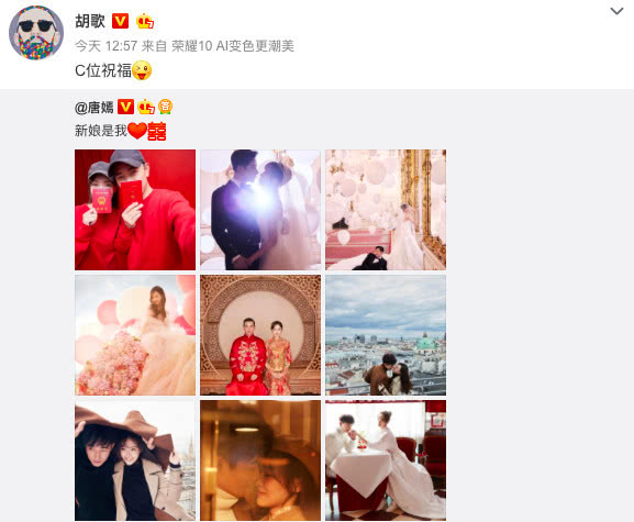 Cũng trong ngày hỉ sự hôm nay của cặp vợ chồng La Tấn - Đường Yên, Hồ Ca cũng đã phát weibo “C vị chúc phúc” để chúc phúc cho cả hai.