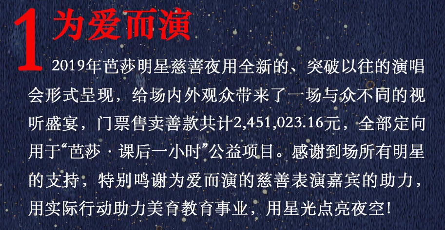Đêm diễn chia làm 4 phần quyên góp. Ở phần đầu “Vì yêu mà diễn”, với những tiết mục đánh đàn Piano, phần trình diễn hai ca khúc của nhóm nhạc Hỏa tiễn thiếu nữ 101 cùng sự thể hiện bài hát Thỏa mãn của Tiêu Chiến đã quyên góp đấu giá được 2,45 triệu NDT (8,3 tỷ đồng).