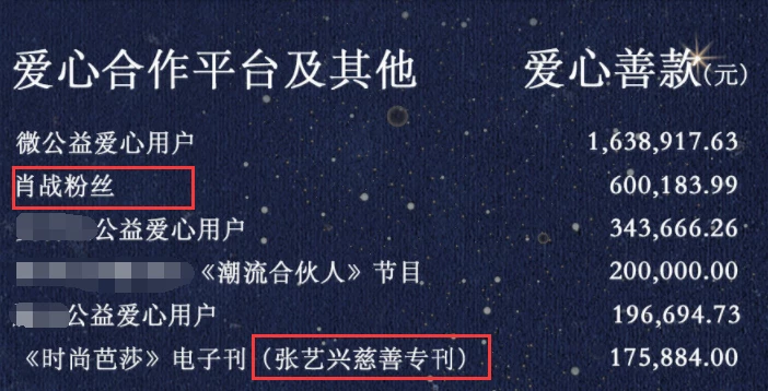 Trong hạng mục thứ tư “Những trái tim nhân ái” đã quyên góp được 3,1 triệu NDT. Trong đó, fan hâm mộ Tiêu Chiến ủng hộ 600 ngàn NDT, số báo tạp chí Bazaar của Trương Nghệ Hưng ủng hộ 1,75 triệu NDT.