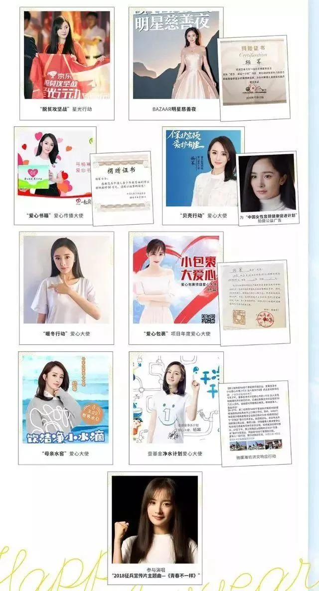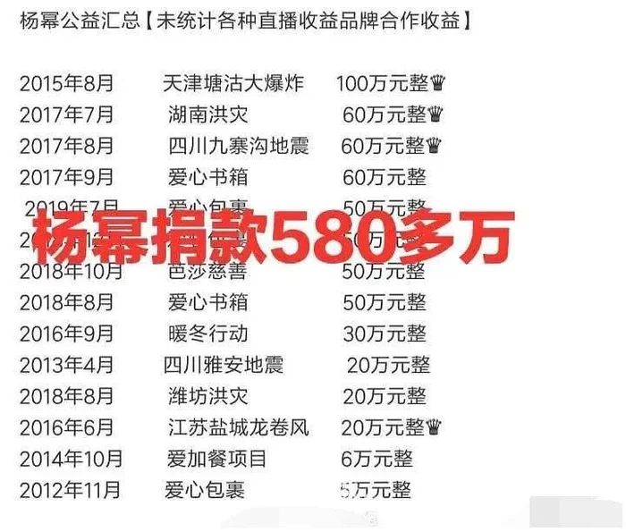 Từ 2012 đến 2019, tổng số tiền mà Dương Mịch ủng hộ những hoàn cảnh khó khăn, hoạt động công ích lên đến 5,8 triệu NDT (tương đương 19,7 tỷ đồng). Số liệu này cũng chưa thể hiện đầy đủ những đóng góp cho hành động thiện nguyện suốt nhiều năm qua của Dương Mịch. Chứng tỏ suốt thời gian qua, nữ diễn viên vẫn luôn âm thầm làm việc thiện, công ích giúp đời.