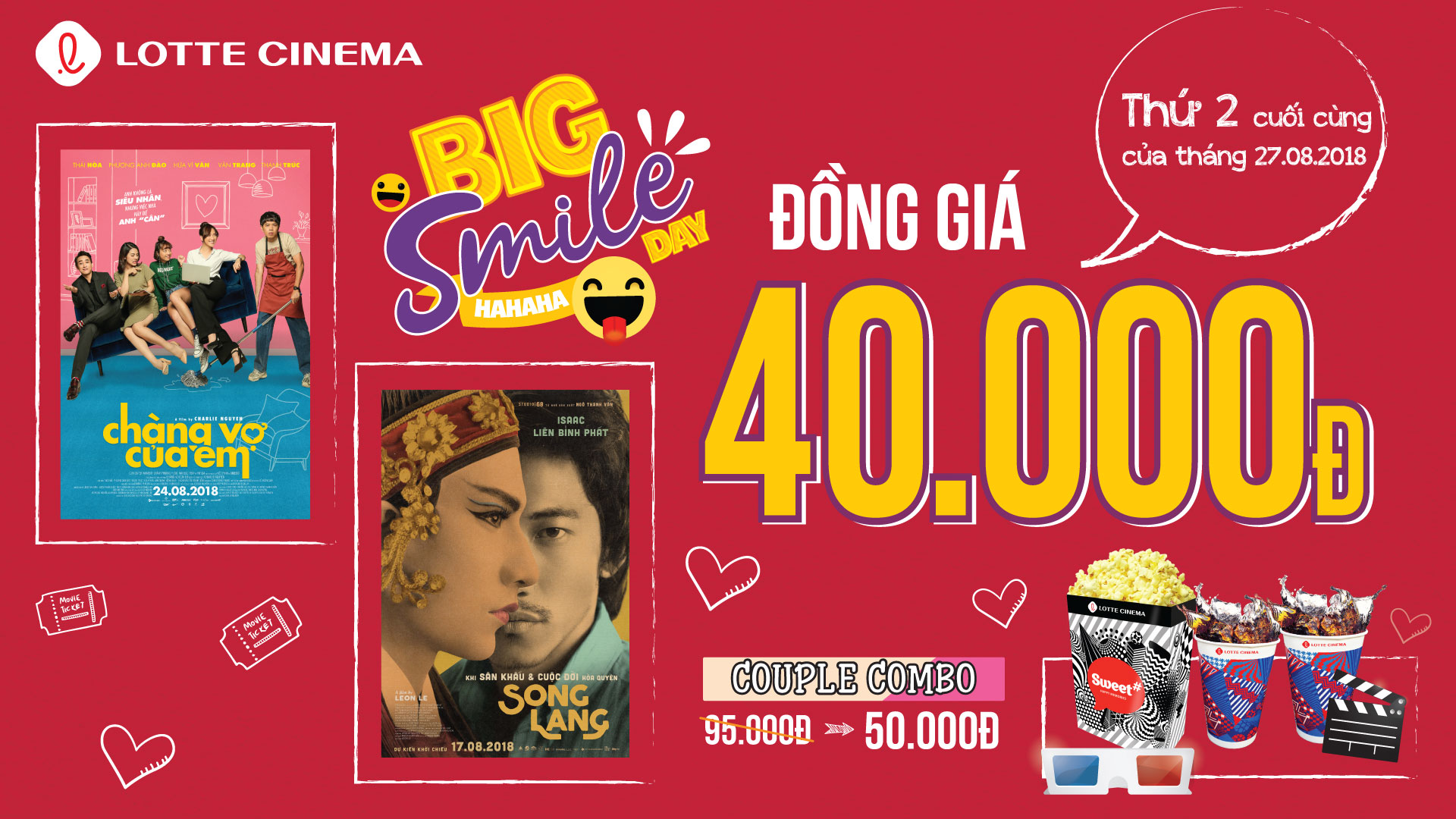 Nhân dịp hai phim Việt ấn tượng cùng nhau chiếu rạp, Lotte Cinema mang tới ưu đãi giá vé mới cho ngày thứ 02 cuối tháng - Big Smile Day chỉ còn 40,000 đồng/vé 2D. Mức giá này thấp nhất từ trước tới nay tại hệ thống rạp cao cấp của Hàn Quốc này. Khán giả quan tâm vào website để xem chi tiết.