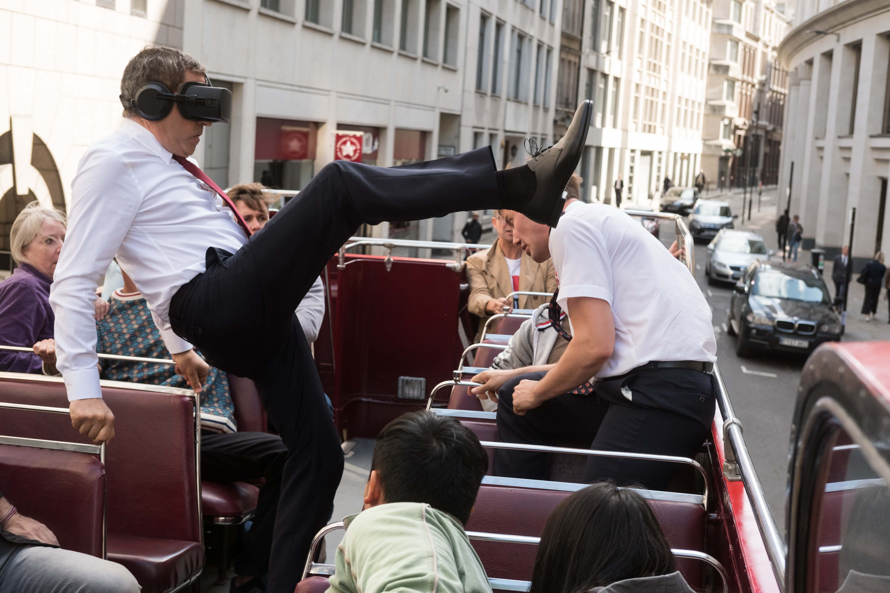 Cảnh English sử dụng kính VR phá banh thành phố.