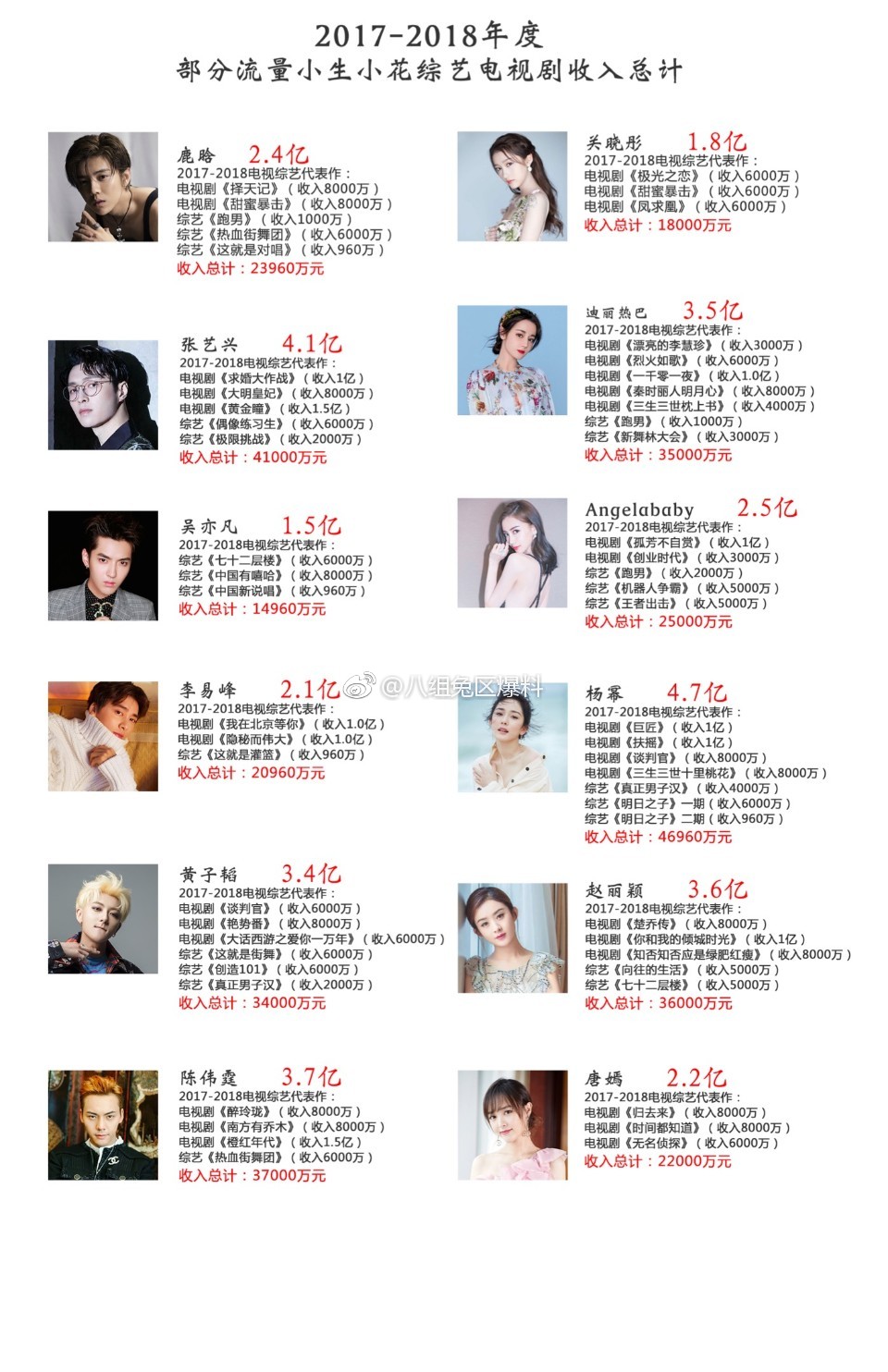 Một bảng danh sách về thu nhập và mức cát sê cho từng dự án của lưu lượng được lan truyền trên mạng xã hội Weibo, về độ chính xác của bảng “kê khai” này vẫn là một ẩn số. Hãy cùng SAOstar điểm qua những nghệ sĩ Trung Quốc có mức thu nhập hằng năm đáng nể nhất theo danh sách được hé lộ này nhé!