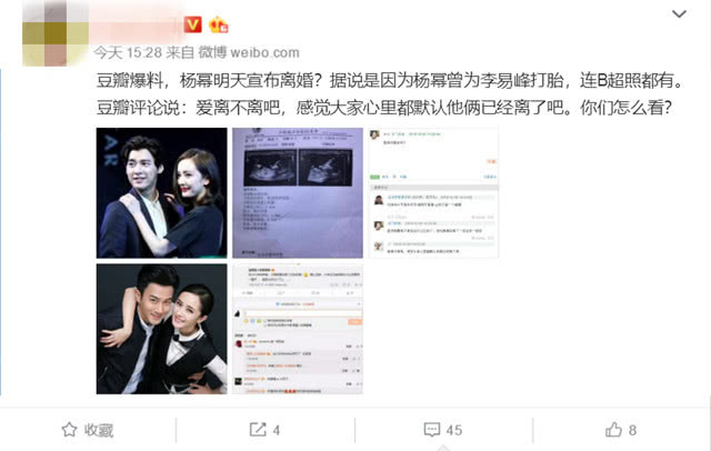 Mới đây nhất, ngày 20 tháng 12 có một cư dân mạng tiết lộ cho biết ngày 21, Dương Mịch sẽ tuyên bố tin tức ly hôn với mọi người. Ngoài công khai tin tức ly hôn ra thì theo một blogger cho biết nguyên nhân thật sự dẫn đến chuyện ly hôn của hai người không phải là vì tấm hình Lưu Khải Uy bị chụp được mà chính là chuyện Dương Mịch từng mang thai đứa con của Lý Dịch Phong (李易峰), đến cả bức hình siêu âm cũng được đưa lên.