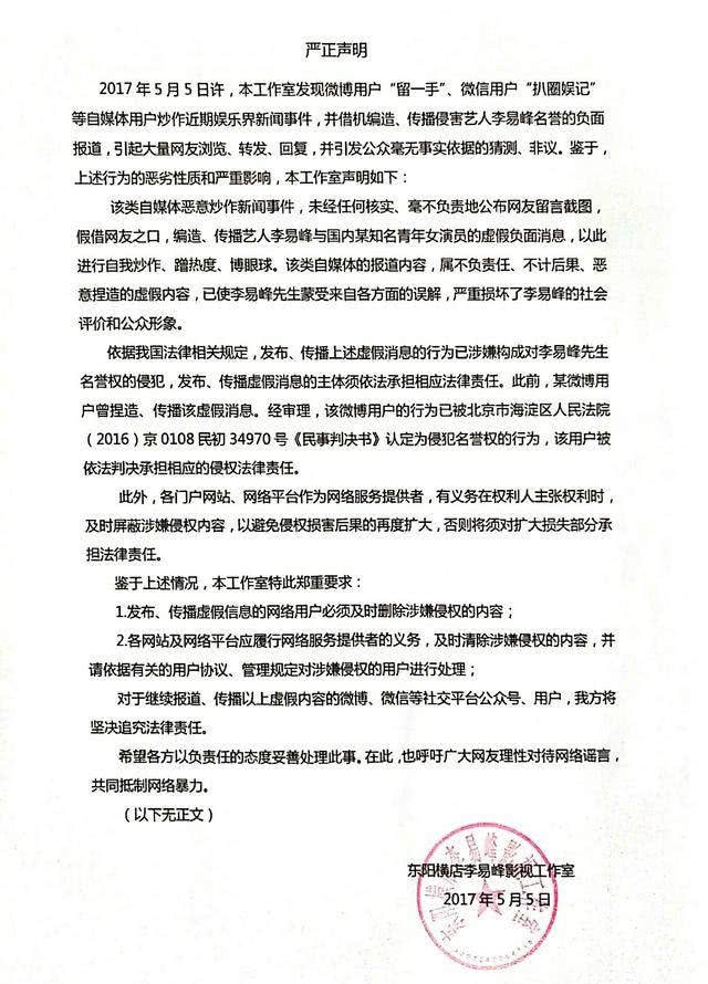 Còn về việc liên quan đến Lý Dịch Phong và Dương Mịch thì trước đây cũng có người tung tin đồn và bị Studio Lý Dịch Phong khởi tố, đồng thời lên tiếng thanh minh tất cả tin tức đều là giả. Lý Dịch Phong cũng sớm đã thắng kiện, người tung tin đồn kia cũng phải lên tiếng xin lỗi đồng thời bồi thường tổn thất danh dự cho Lý Dịch Phong.