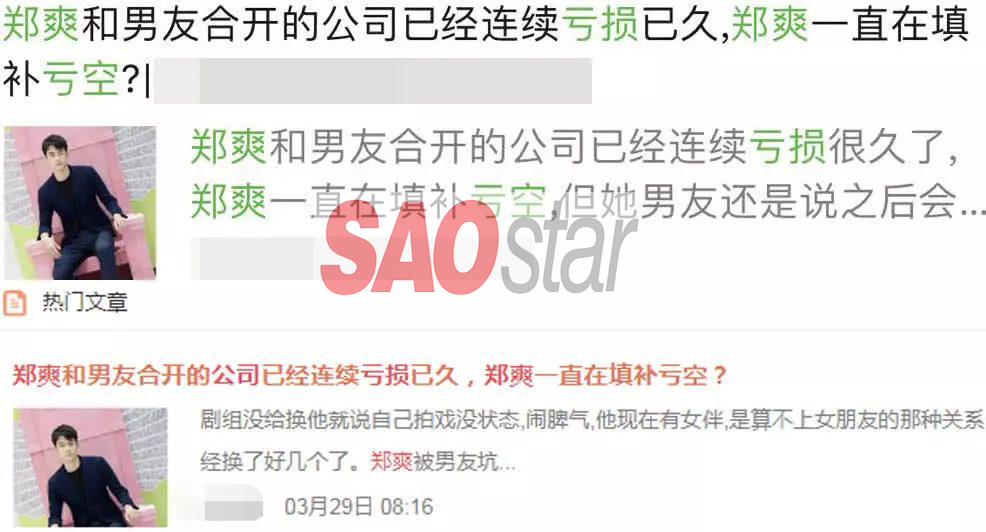 Vài ngày trước trên Weibo có thông tin cho rằng công ty do Trịnh Sảng và Trương Hằng cùng hợp tác thành lập liên tục bị thua lỗ. Trong khi đó, Trịnh Sảng nhất quyết một mực bù lỗ phần thâm hụt. Người đăng tin đồn này còn “tiết lộ” thêm rằng nữ diễn viên đã bị bạn trai lừa gạt, công ty thua lỗ đã lâu nhưng chỉ có Trịnh Sảng là người đứng ra bỏ tiền để bù vào, Trương Hằng vẽ ra tương lai sáng lạn của công ty để Trịnh Sảng tiếp tục tin tưởng mà dốc lòng đổ tiền. Thế là Trịnh Sảng như bị tẩy não, không nghe lời thuyết phục của bất kỳ ai, đem phần lớn thu nhập, cát sê của mình mà đầu tư vào công ty đó.