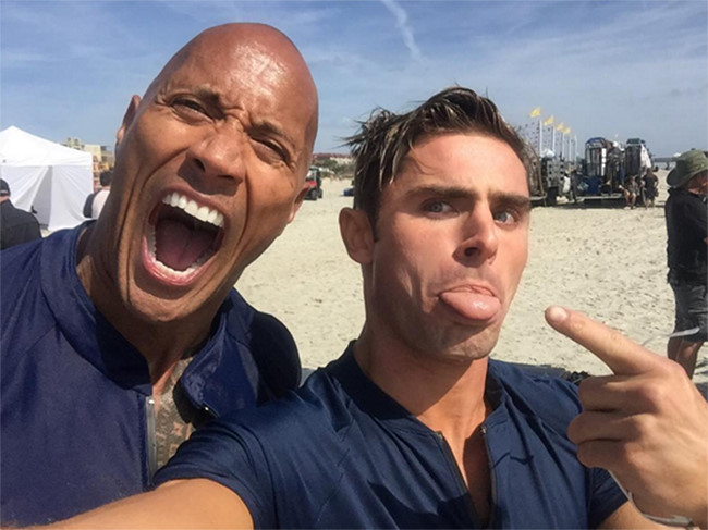 The Rock và Zac Efron trên trường quay Baywatch. Ảnh: Paramount.