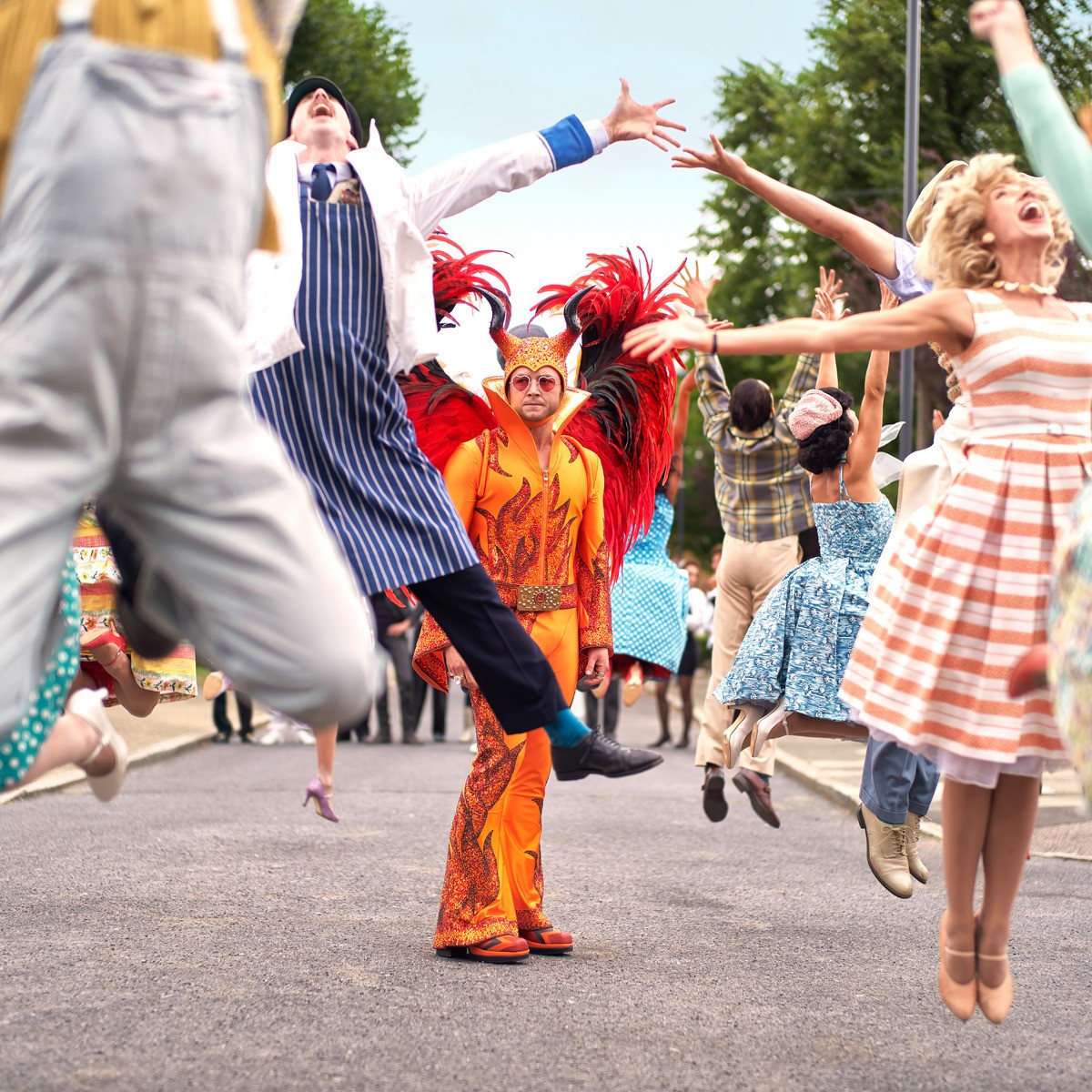 Rocketman mở đầu theo một cách không thể “bùng cháy” hơn. Elton John (Targon Ergeton) trong bộ quần áo đỏ cam, với đôi cánh to tướng cùng cặp sừng dê hùng dũng. Thông thường khán giả chỉ được biết tới hình ảnh rực rỡ của các ngôi sao khi họ “comeback” trên sân khấu, nhưng lần này chúng ta được chứng kiến một Elton nổi bần bật ngang nhiên bước vào… trung tâm cai nghiện. Chỉ riêng cảnh này đã cho thấy sau Bohemian Rhapsody, Dexter Fletcher rất muốn có được toàn quyền sáng tạo và bứt phá với thứ gì đó khác biệt trong Rocketman.