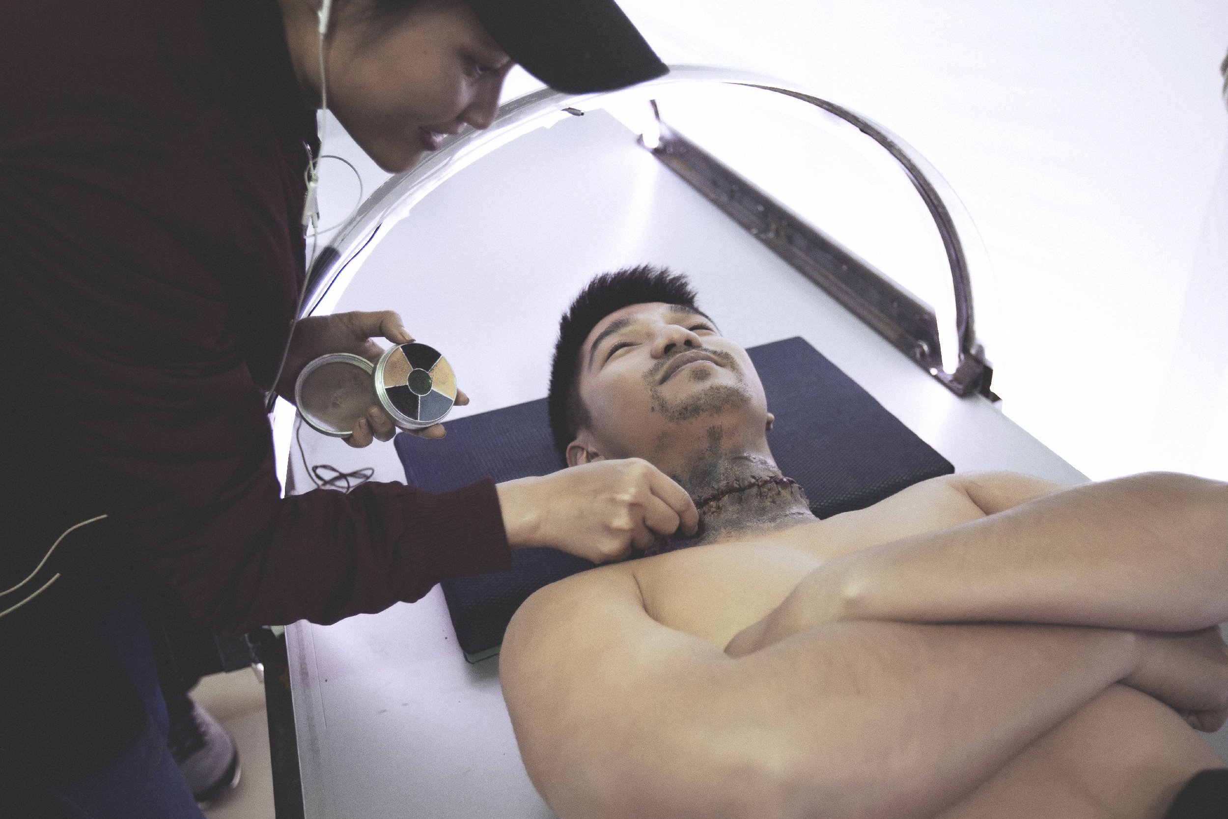Chuyên viên hóa trang đang chuẩn bị cho cảnh quay “cắt đổi đầu người”.