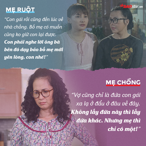 Dù cho Vân phụng phịu: “Con với mẹ anh Thanh chỉ là cùng yêu một người đàn ông thôi, chứ con có cướp cái gì của ai đâu”, bà Bằng vẫn nhẹ nhàng, từ tốn khuyên giải. Nghe câu dặn dò của mẹ đẻ Vân cũng khiến nhiều khán giả nữ chạnh lòng khi nghĩ đến mẹ mình. Dù cho có chuyện gì xảy ra, bố mẹ đẻ vẫn mong con gái có được những điều tốt nhất, nhưng cũng lại sợ nhà chồng chê cười, hàng xóm dị nghị. Họ luôn quay cuồng, day dứt nhưng cũng bất lực trong việc can thiệp vào cuộc sống riêng của con gái.