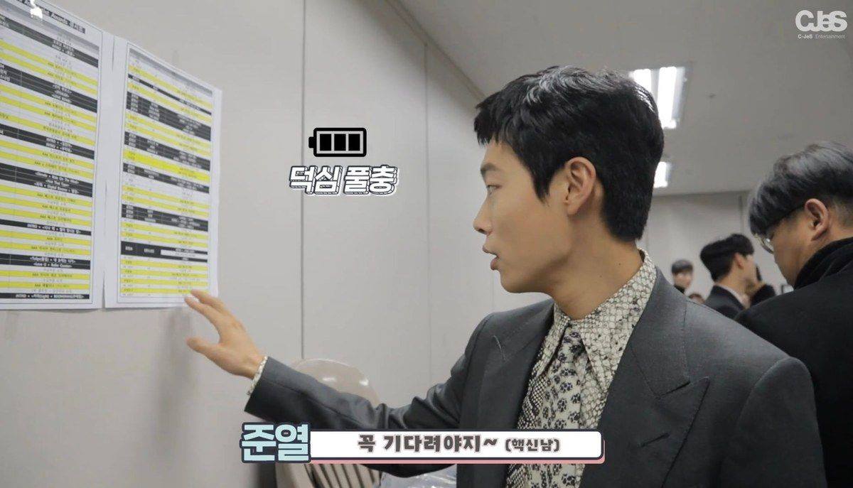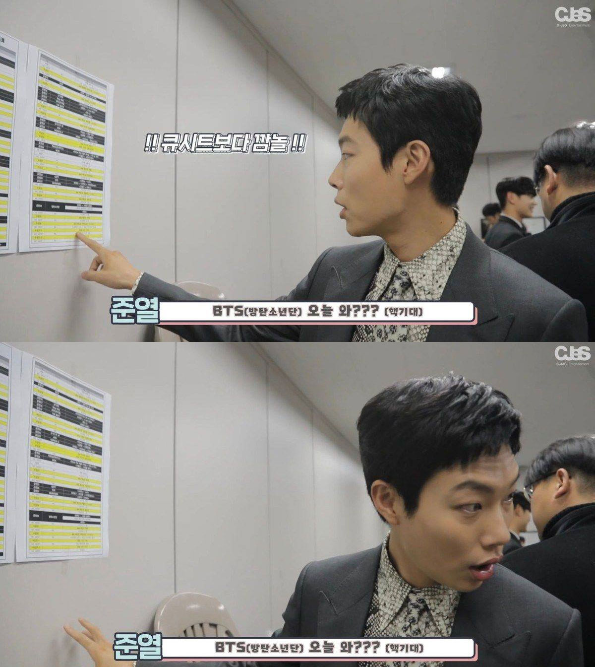 Ryu Junyeol đột nhiên ngạc nhiên khi đọc tên BTS trên tờ giấy. Sau đó anh hỏi nhân viên, “BTS có đến hôm nay không?” Ngay sau khi nhân viên xác nhận điều đó, Ryu Joonyeol trông rất hào hứng và anh ấy mỉm cười.