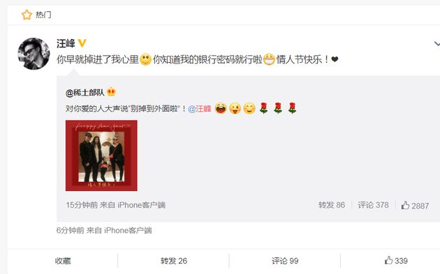 Trong khi đó, vợ chồng của nữ diễn viên Chương Tử Di và nhạc sĩ Uông Phong cũng khiến người ta ganh tỵ không kém. Nữ chính Thập diện mai phục đăng ảnh chụp cùng gia đình: “Lớn tiếng nói với những người thân yêu: 'Sẽ không để đánh rơi một ai”. Ngay sau đó, Uông Phong cũng đã trả lời: “Em đã rơi vào trái tim anh mất rồi! Em cũng biết mật khẩu ngân hàng của anh đó. Valentine hạnh phúc nhé”.