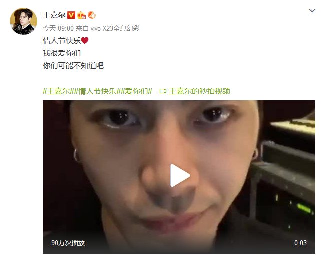 Vương Gia Nhĩ: “Ngày lễ tình nhân vui vẻ! Tôi rất yêu các bạn nhưng các bạn có lẽ không biết đâu”.