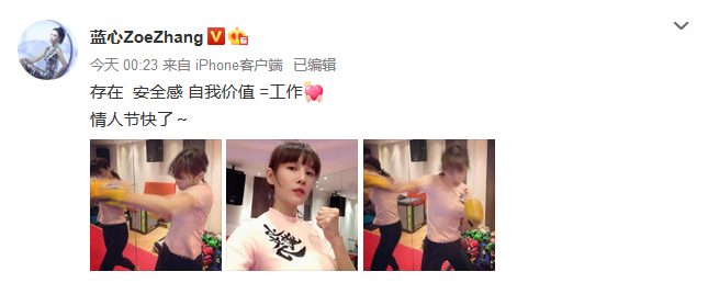 Trương Lam Tâm: “Cảm giác an toàn tồn tại giá trị trong người tôi chính là công việc. Lễ tình nhân vui vẻ”.