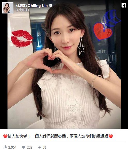 Nữ siêu mẫu Đài Loan Lâm Chí Linh đăng tải hình ảnh với biểu tượng trái tim: “Lễ tình nhân thật vui vẻ. Một người cũng vui, hai người thì hạnh phúc”.
