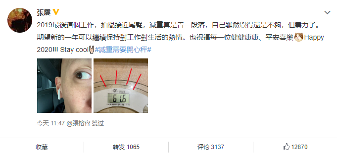 Hơi khác so với các sao Hoa ngữ, Trương Chấn ghi một đoạn nội dung khá dài để gửi gắm đến những khán giả đã lo lắng, quan tâm đến mình: “Công việc cuối cùng của năm 2019. Việc quay hình cũng đã sắp hết nên chuyện giảm cân tạm thời dừng lại. Bản thân cảm thấy chưa đủ lắm nhưng mà đã cố gắng hết sức rồi. Hi vọng trong năm mới vẫn sẽ giữ được lòng nhiệt huyết đối với công việc đối với cuộc sống. Tôi cũng xin chúc mỗi một người đều khỏe mạnh, bình an, vui vẻ. Happy 2020. Stay cool!!!”