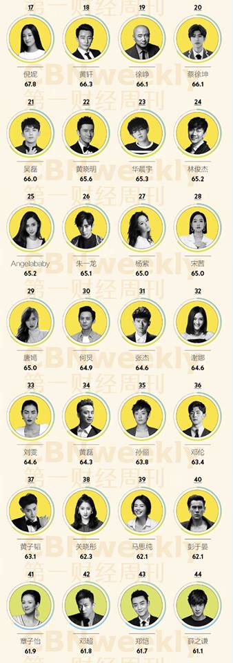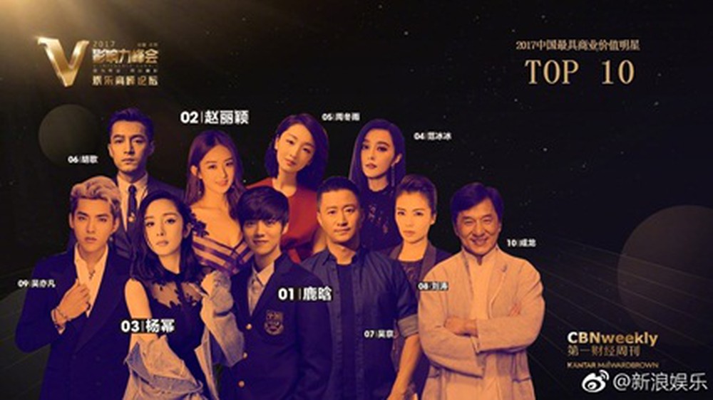 Thời điểm 31/12 chuẩn bị gần kề, chẳng ai muốn tên mình ở thứ hạng nhất nhì trong top giá trị thương mại hay thu nhập để cục thuế để mắt đến. Hàng loạt những cái tên trong top 10 giá trị thương mại 2017 lại bị giảm thứ hạng đáng kể so với thứ bậc năm 2018. Lộc Hàm từ vị trí số 1 (2017) rớt xuống đứng thứ 10 trong năm nay, Triệu Lệ Dĩnh rơi khỏi top 10 (2018) trong khi năm ngoái lại xếp vị trí thứ 2. Cặp vợ chồng Angelababy và Huỳnh Hiểu Minh thứ bậc đều giảm đáng kể dù cả hai liên tiếp có những tác phẩm mới ra mắt trong năm. Điều đáng bất ngờ hơn Phạm Băng Băng từ vị trí thứ 4 (2017) năm nay lại mất tích khỏi top 100.