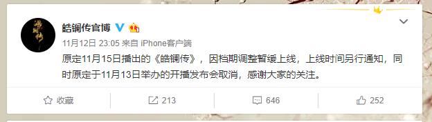 Tuy nhiên, vào sáng ngày 13/11, weibo chính thức của phim và các trang tin Trung Quốc đồng loạt đưa tin hoãn chiếu bộ phim Hạo Lan truyện. Nguyên nhân và thời điểm trình chiếu chính xác chưa được đưa ra. Buổi họp báo ra mắt đoàn phim vào ngày hôm nay cũng bị hủy bỏ.