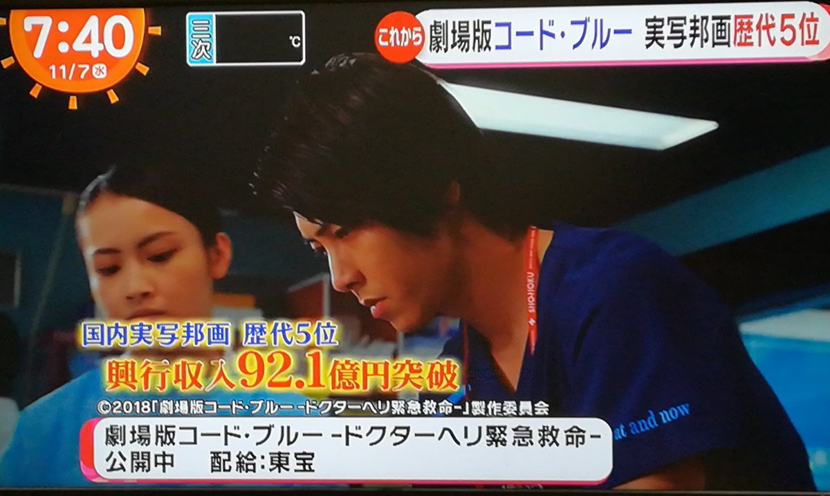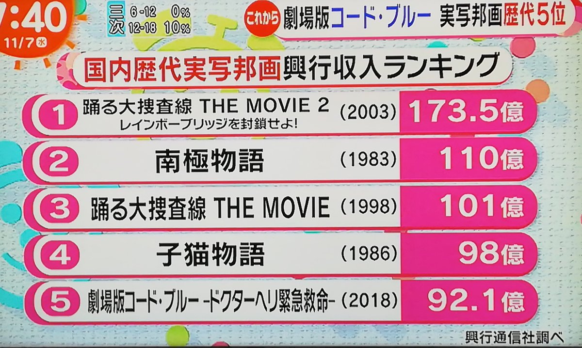 Đối thủ của Code Blue The Movie là Thám tử lừng danh Conan: Kẻ hành pháp Zero từ khi phát hành bổ sung phiên bản 4DX vào ngày 19/10, doanh thu hiện tại cũng đã lên tới 9,1 tỷ yên nên ngôi vị quán quân 2018 chính thức thuộc về bộ phim nào vẫn là một ẩn số.