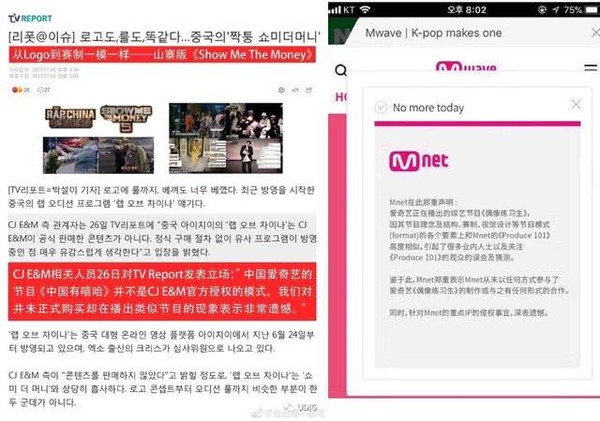 “Chương trình Produce 101 là tiết mục giải trí do tự chính công ty CJ E&M nghiên cứu và thiết kế ra. Từ những chi tiết thiết kế tiết mục cho đến kỹ xảo sân khấu, hậu trường của chương trình Thực tập sinh thần tượng của kênh đài IQIYI có thể thấy được toàn bộ đều là sao chép mà ra. Thế nhưng IQIYI lại không hề trả chi phí bản quyền cho công ty CJ E&M chúng tôi. Từ đoạn clip được phát sóng tuyên truyền, mọi người có thể dễ dàng thấy được rằng Idol Producer là phiên bản Trung Quốc của chương trình Produce 101“.