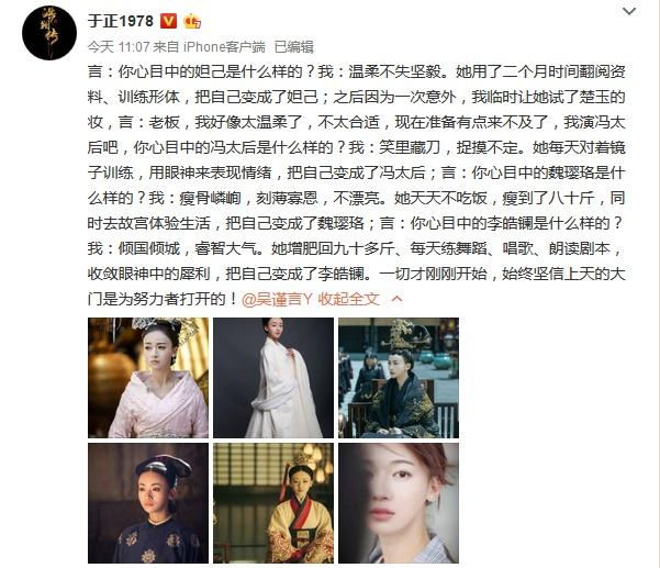 - Tôi (Vu Chính) nói: Xinh đẹp nghiêng nước nghiêng thành, cơ trí dũng cảm. Cô ấy tăng cân lên hơn 90 cân (=45kg), mỗi ngày luyện vũ đạo, ca hát, đọc kịch bản, luyện tập ánh nhìn sắc bén, biến mình thành Lý Hạo Lan.