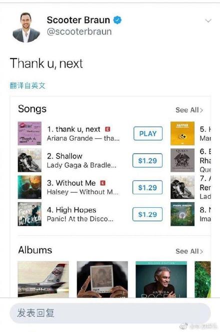 Ngay lập tức, quản lý của Ariana Grande cũng đã đăng bài chúc mừng ca khúc “Thank U, Next” của Lady gaga đứng nhất trên bảng iTunes của khu vực Mỹ. Bên cạnh đó, Ariana Grande cũng đã like một bài viết về việc ca khúc của Ngô Diệc Phàm bị xóa khỏi bảng và HDD của Mỹ đưa tin Ngô Diệc Phàm đến từ Trung Quốc là tên lừa gạt…