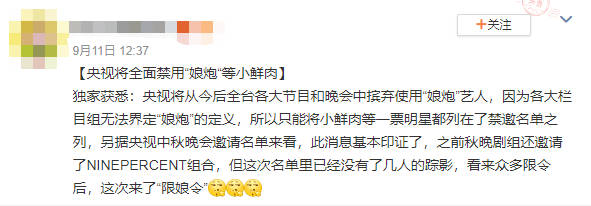 Cách đây không lâu, vào giữa tháng 9 năm 2018 CCTV từng ra lệnh cấm sử dụng “nghệ nhân nương pháo” trong các chương trình tiết mục, đêm hội lớn. Thêm vào đó, các đơn vị tổ chức các tiết mục lớn không thể nào định nghĩa được hàm ý của hai chữ “nương pháo” này là gì (Nương pháo thuộc về hình dung từ, ý chỉ những nam sinh có hành vi, cử chỉ, tính cách rất giống con gái, nhưng không liên quan đến tướng mạo đẹp hay không. Không thể vì thấy nam nhân “xinh đẹp” mà đặt cho họ cái tên “nương pháo” hay nói một cách ngắn gọn chính là ẻo lả, đàn ông nhưng điệu bộ, tính tình như nữ), cho nên họ đành phải ngậm ngùi mà loại bỏ những tiểu thịt tươi có tên tuổi ra khỏi danh sách.