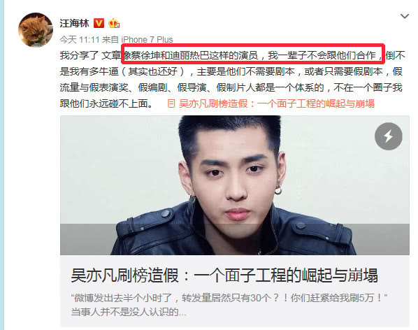 Vào tháng 11 vừa qua, với sự kiện Ngô Diệc Phàm bị tố là dùng thủy quân, có gian lận trong thị trường âm nhạc Mỹ khi một số bài hát đứng đầu bảng xếp hạng của anh bất ngờ bị gỡ xuống thì vị biên kịch này cũng từng lên tiếng chỉ trích cho biết: “Thái Từ Khôn và Địch Lệ Nhiệt Ba - những diễn viên như thế này, cả đời tôi cũng sẽ không hợp tác với bọn họ… Chủ yếu là họ không cần kịch bản, hoặc thứ họ cần chỉ là hệ thống kịch bản “giả”, lưu lượng giả, và giải thưởng giả, biên kịch giả, đạo diễn giả, chế tác giả. Không ở trong một vòng tròn thì tôi mãi mãi sẽ không bao giờ đụng mặt với họ” và kèm theo bức hình Ngô Diệc Phàm phía dưới.