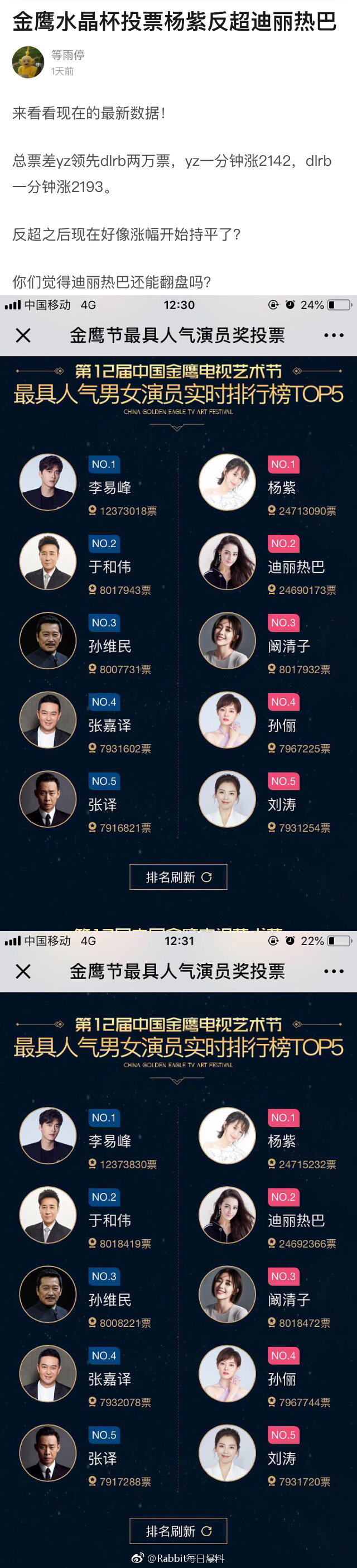 Thế nhưng, cuộc bỏ phiếu khán giả của giải thưởng nghệ thuật Kim Ưng Trung Quốc lần thứ 29 kết thúc cách đây không lâu Địch Lệ Nhiệt Ba đã xuất sắc cán đích ở vị trí thứ nhất thì qua đến Kim Ưng Lễ, Nhiệt Ba lại bị Dương Tử vượt lên về số phiếu bầu mặc dù trước đó cô đang là người dẫn đầu. Chỉ trong vòng 1 ngày, số phiếu của Dương Tử được fan cày xuyên đêm tăng hơn 6 triệu lượt votes, tạm thời xuất sắc dẫn đầu bảng xếp hạng.
