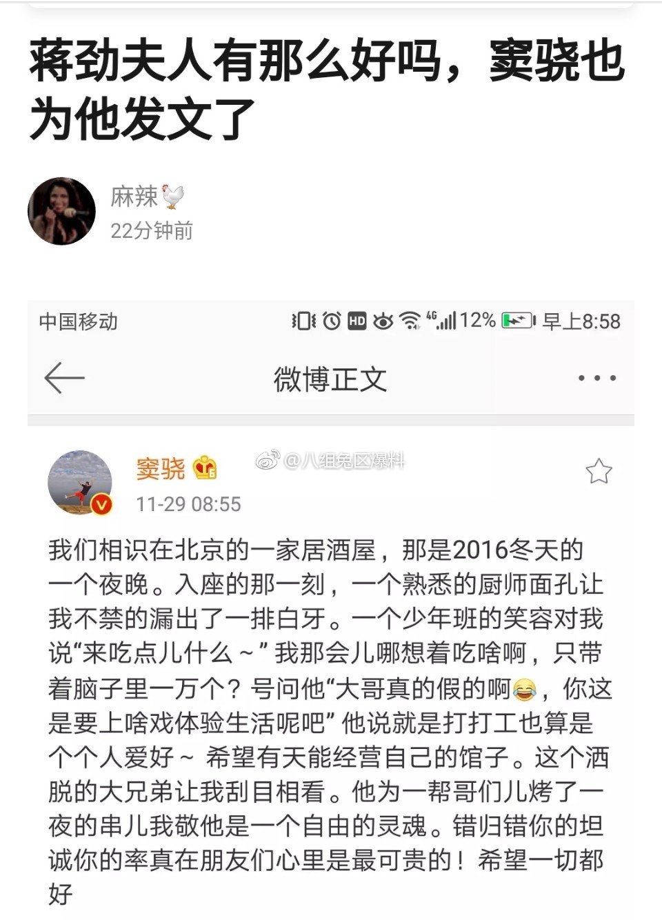 Có rất nhiều dân mạng đặt câu hỏi rằng, Tưởng Kình Phu thực sự tốt như vậy ư? Đến cả Đậu Kiêu cũng lên tiếng cho anh: “Chúng tôi từng quen biết trong một quán rượu ở Bắc Kinh, tôi vẫn nhớ đó là một buổi tối mùa đông năm 2016. Lúc vào chỗ ngồi, có một vị đầu bếp có gương mặt quen thuộc khiến tôi không thể không mỉm cười. Có một chàng trai trẻ cười rạng rỡ hỏi tôi muốn ăn gì, khi đó tôi nào có muốn ăn gì đâu, chỉ là trong đầu có đến một vạn câu hỏi vì sao, rằng vị đại ca này là thật hay giả vậy, anh đang đóng phim hay đang trải nghiệm cuộc sống thực tế thế???