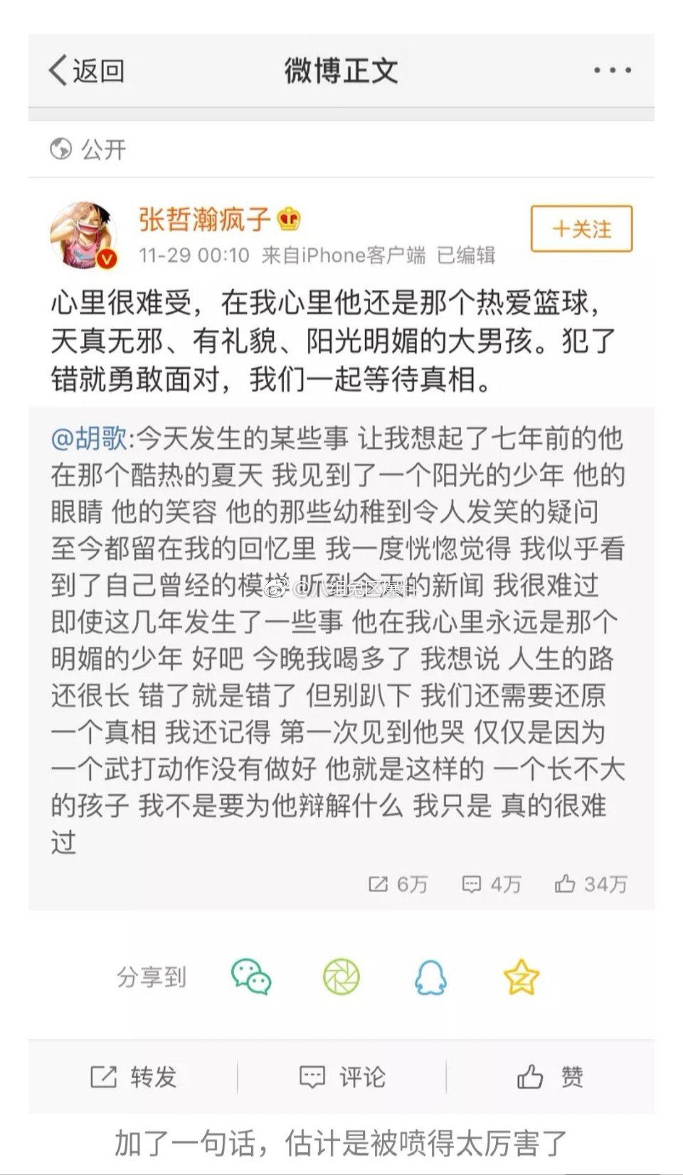 Trương Triết Hạn cũng viết: “Thực sự rất buồn, trong lòng tôi cậu ấy vẫn luôn là một người yêu thích bóng rổ như vậy, ngây thơ trong sáng, lễ phép, một anh chàng luôn tỏa sáng. Phạm sai lầm thì cần phải dũng cảm đối mặt, chúng ta hãy cùng chờ đợi sự thật.”