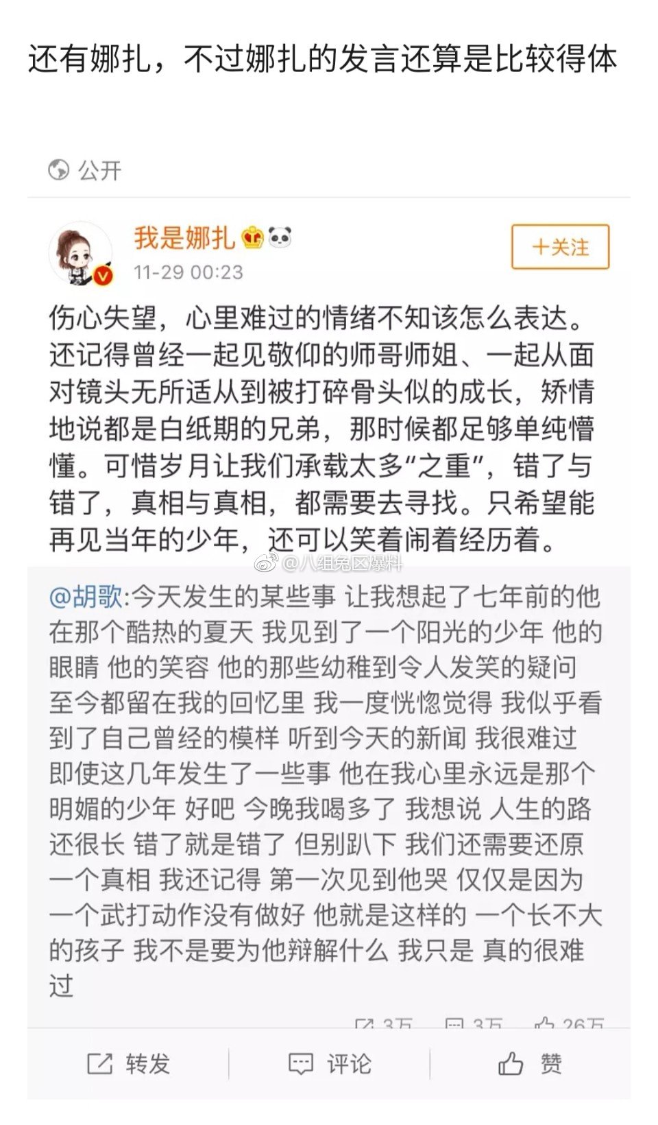 Cổ Lực Na Trát viết: “Buồn và thất vọng. Tôi không biết phải làm thế nào để diễn tả tâm trạng buồn trong trái tim tôi. Vẫn còn nhớ rõ đã cùng nhau ngưỡng mộ các sư huynh, sư tỷ. Cùng bên nhau từ khi đối diện trước ống kính không biết làm gì cho đến khi chịu nhiều vết thương mà trưởng thành. Thật sự mà nói chúng ta đều là anh em từ khi chỉ là trang giấy trắng, khi đó chúng ta đều đơn thuần, ngây thơ. Đáng tiếc, năm tháng trôi qua đã để chúng ta gánh chịu quá nhiều những thứ nặng nề như vậy. Sai thì đã sai, chân tướng vẫn là chân tướng, đều cần phải đi tìm. Chỉ hy vọng có thể gặp lại chàng thiếu niên của năm đó, còn có thể cùng cười, cùng đùa giỡn như chúng ta đã từng“.