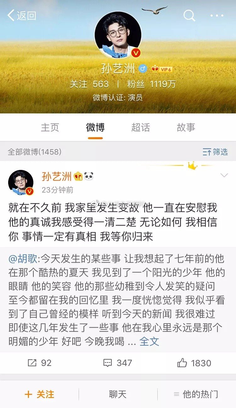 Tôn Nghệ Châu cũng chia sẻ những lời bộc bạch của Hồ Ca với dòng cảm nghĩ: “Cách đây không lâu, gia đình tôi xảy ra biến cố, anh ấy đã luôn ở bên động viên tôi. Tôi hiểu rất rõ sự chân thành của anh ấy, bất luận như thế nào thì tôi cũng luôn tin anh, sự thật nhất định sẽ có ngày sáng tỏ. Tôi đợi anh trở về.”