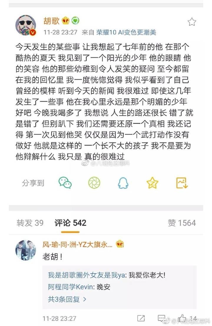 Khuya qua, Hồ Ca đã viết tâm thư, bày tỏ quan điểm, suy nghĩ của mình đối với sự việc của Tưởng Kình Phu: “Hôm nay xảy ra một số chuyện, làm tôi nhớ đến chàng thiếu niên của bảy năm trước, trong một mùa hè nóng bức, tôi nhìn thấy một thiếu niên tựa như ánh mặt trời, ánh mắt, nụ cười của cậu ấy, kể cả những chất vấn thật ấu trĩ làm người khác phải bật cười. Đến này đều được lưu lại trong hồi ức của tôi.