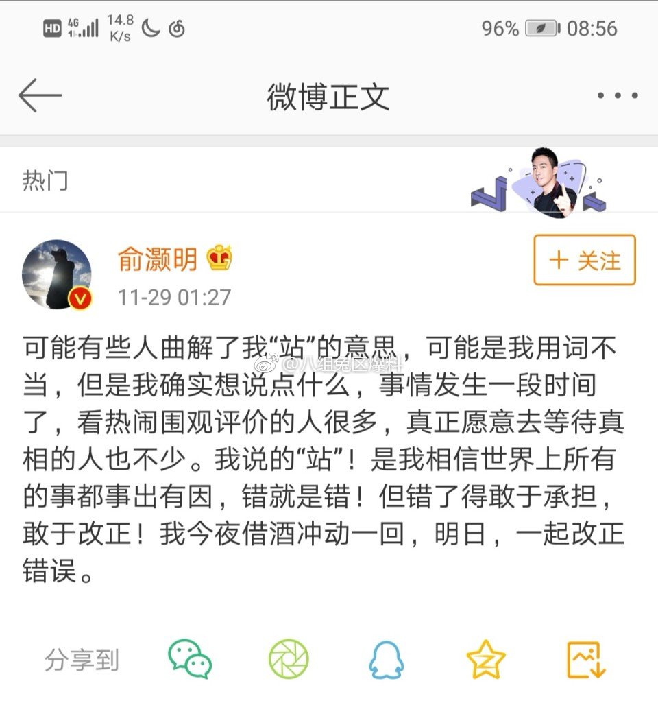 Du Hạo Minh viết: “Có lẽ một số người đã hiểu sai nghĩa của từ 'đứng' trong câu nói của tôi. Có thể tôi dùng từ không thích hợp cho lắm, nhưng thực sự tôi cũng muốn nói điều gì đó. Chuyện đã xảy ra được một khoảng thời gian rồi, có rất nhiều người đứng ngoài chỉ để xem và bình luận mua vui, có quá ít người thực sự tin và chờ đợi chân tướng sự việc. Tôi nói 'đứng' ở đây là bởi tôi tin rằng tất cả mọi chuyện trên thế giới này đều có nguyên do của nó cả. Sai là sai, nhưng khi đã sai rồi thì phải dũng cảm thừa nhận cái sai, sửa chữa cái sai. Đêm nay tôi đành mượn rượu để kích động một lần, ngày mai chúng ta sẽ cùng sửa chữa sai lầm vậy.”