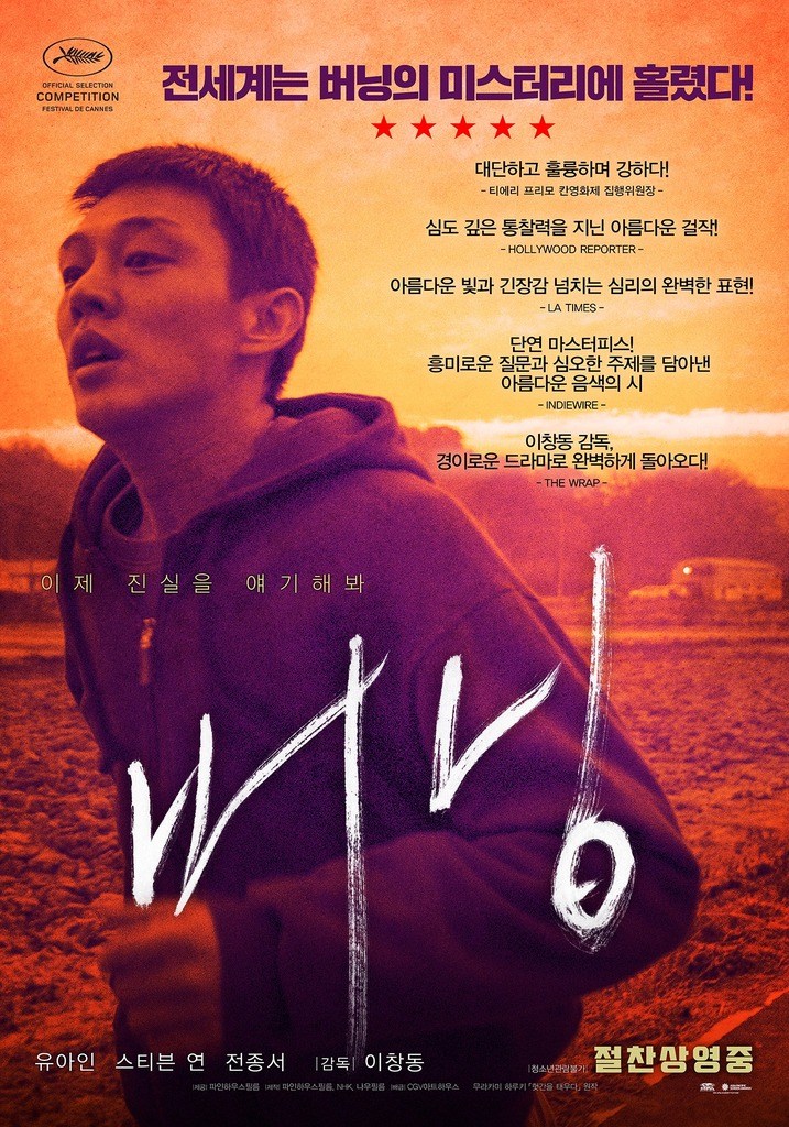 Burning là bộ phim kinh dị, bí ẩn của đạo diễn Lee Chang Dong, người từng vinh dự giành giải thưởng Kịch bản xuất sắc nhất tại LHP Cannes năm 2010. Bộ phim được chuyển thể dựa trên truyện ngắn Barn Burning đăng trên tờ The New Yorker của nhà văn Haruki Murakami mô tả sự bất an, bất lực và giận dữ của những người trẻ Hàn Quốc thông qua câu chuyện của Jong Soo (Yoo Ah In), một nhân viên bán thời gian đồng thời là một tiểu thuyết gia đầy tham vọng và hai người bạn của anh là Hae Mi (Jeon Song Seo) và Ben (Steven Yeun). Tại LHP Cannes lần thứ 71 vừa qua, Burning đã nhận được giải thưởng của Hiệp hội Phê bình báo chí ở hạng mục trao giải độc lập.