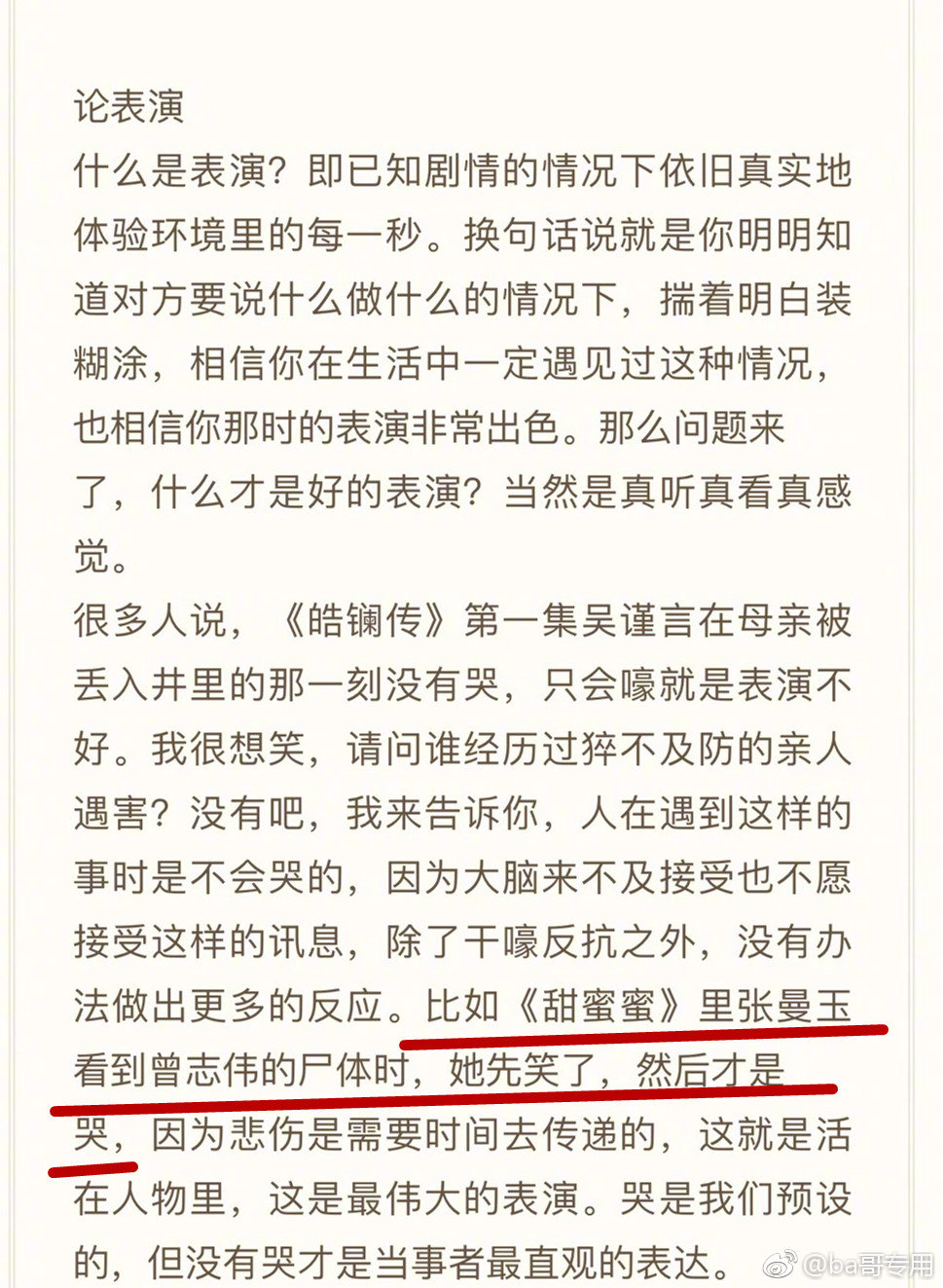 “Thế nào gọi là diễn xuất? Chính là trong trong tình huống bạn biết rõ đối phương sẽ làm gì tiếp theo nhưng vẫn phải giả vờ như chưa từng hay biết, tin chắc rằng các bạn trong cuộc sống cũng sẽ gặp phải tình huống nay, tin chắc rằng các bạn trong thời khắc đó cũng biểu hiện rất tốt? .. Rất nhiều người nói tập đầu tiên của Hạo Lan truyện, Ngô Cẩn Ngôn khi nhìn thấy mẫu thân của mình bị ném xuống giếng nhưng lại không hề khóc, chính vì vậy mà nói cô ấy diễn xuất không tốt. Thật buồn cười, xin hỏi các bạn trong đây ai đã gặp phải cảnh người thân bị hại nhưng không thể phản kháng chưa? Chắc không có rồi, vậy để tôi nói cho bạn biết, con người khi gặp phải tình huống bất ngờ này ngoại trừ phản kháng ra thì sẽ không có cách nào để có thể đưa ra thêm nhiều phản ứng khác được. Ví dụ như Trương Mạn Ngọc trong bộ phim Điềm mật mật khi nhìn thấy thi thể của Tăng Chí Vỹ, cô ấy bật cười trước tiên rồi mới đến khóc. Bởi vì đau khổ cần có thời gian để cảm nhận, như vậy mới thực sự sống trong nhân vật, là diễn xuất vĩ đại nhất...”