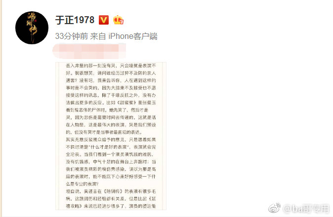 Chính việc vấp phải chỉ trích về diễn xuất chỉ sau một tập được công chiếu này của Ngô Cẩn Ngôn, ngày hôm nay Vu Chính cũng đã lên tiếng bênh vực thay cô với bài viết trên weibo cá nhân của mình: