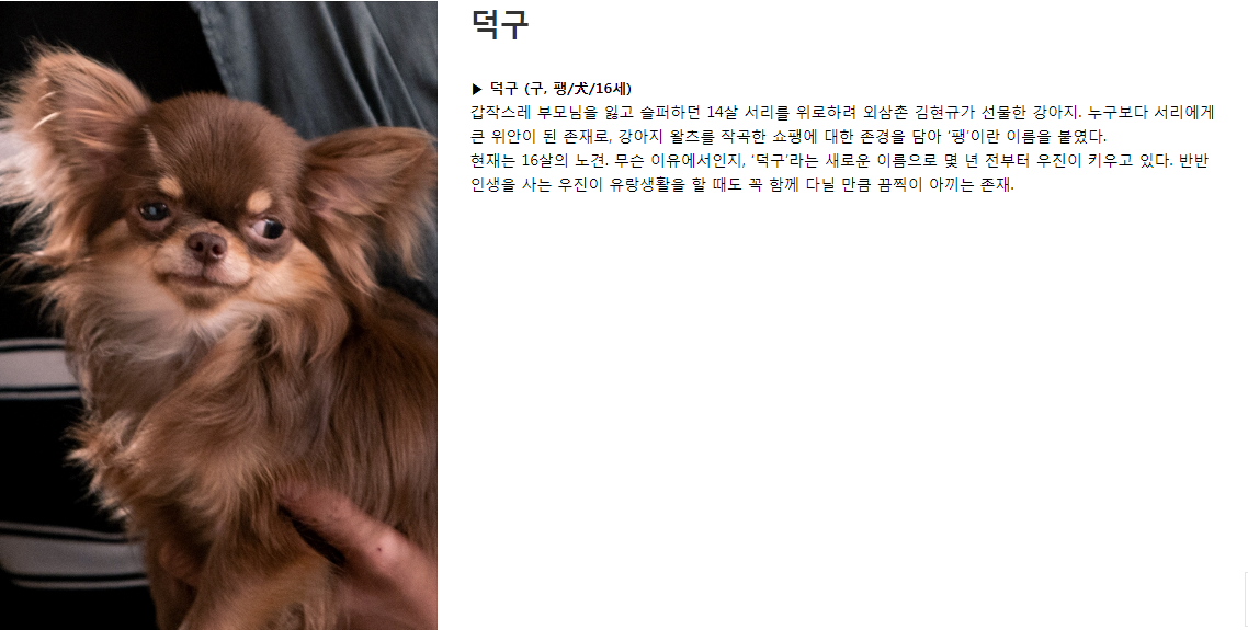 Được biết, DeokKu là một chú chó Chihuahua có lông dài màu sô cô la. DeokKu đã liên kết các nhân vật chính thông qua những cảnh hài hước cũng như gợi ý cho người xem về những câu chuyện sẽ xảy ra tiếp theo. DeokKu là một nhân vật quan trọng trong câu chuyện và diễn xuất của chú chó được khán giả đánh giá là rất hoàn hảo.