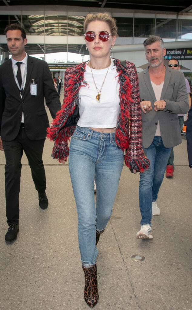 Ngôi sao Amber Heard của phim Aquaman và Justice League (Liên Minh Công Lý) đến Cannes trong chiếc áo khoác vải tuýt, denim lưng cao và đôi bốt in hình động vật.