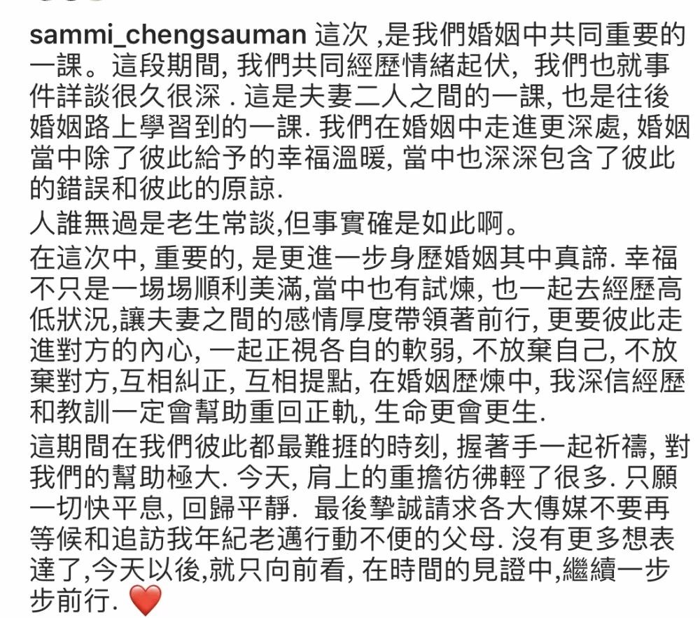 Sau khi Hứa Chí An xin lỗi, Mã Quốc Minh cũng lên tiếng tha thứ cho “bạn gái”, hi vọng mọi người cho cô ấy một chút không gian riêng tư. Tiếp đến, “nữ chính” Huỳnh Tâm Dĩnh cũng viết một bài đăng dài, cảm thấy có lỗi rất nhiều với Mã Quốc Minh. Rồi người cuối cùng Trịnh Tú Văn cũng ra mặt tha thứ cho chồng, hai người sẽ cùng nhau đối mặt với những khó khăn trong tương lai. Những tưởng vụ việc đến đây là kết thúc nhưng thật sự không phải là như thế.