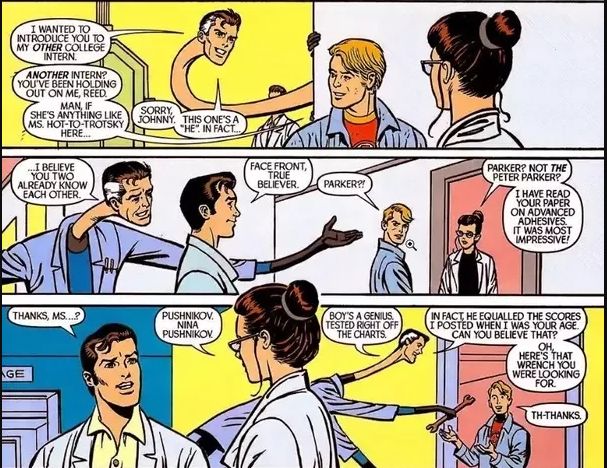Hẳn các sẽ nghĩ ngay rằng,vậy chỉ số IQ của thiên tài số một Trái Đất - Reed Richards. Ở Earth-616, Reed chưa được đo số IQ bao giờ. Tuy nhiên, trong Ultimate Fantastic Four #20, phiên bản Reed của Earth-1610 đã được đo là có IQ lên tới 267 khi ở tuổi 16 và trong Secret Wars #6, khi Reed của Earth-1610 gặp gỡ phiên bản của mình ở 616, anh thấy rằng Reed của 616 chỉ là một phiên bản tình cảm, mềm yếu hơn của mình. Vậy so sánh chỉ số IQ giữa Peter và Reed thì sao? Trong Spider-Man/Human Torch #3, Reed đã nhận định rằng Spider-Man là một thiên tài và thậm chí điểm thi đầu vào đại học của Peter còn ngang cao với Reed ở độ tuổi đó.